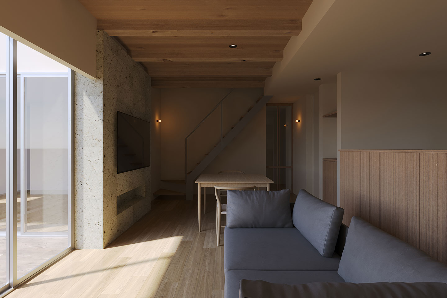 天井には梁あらわしとラワン材を組み合わせ、木の存在を感じながらも